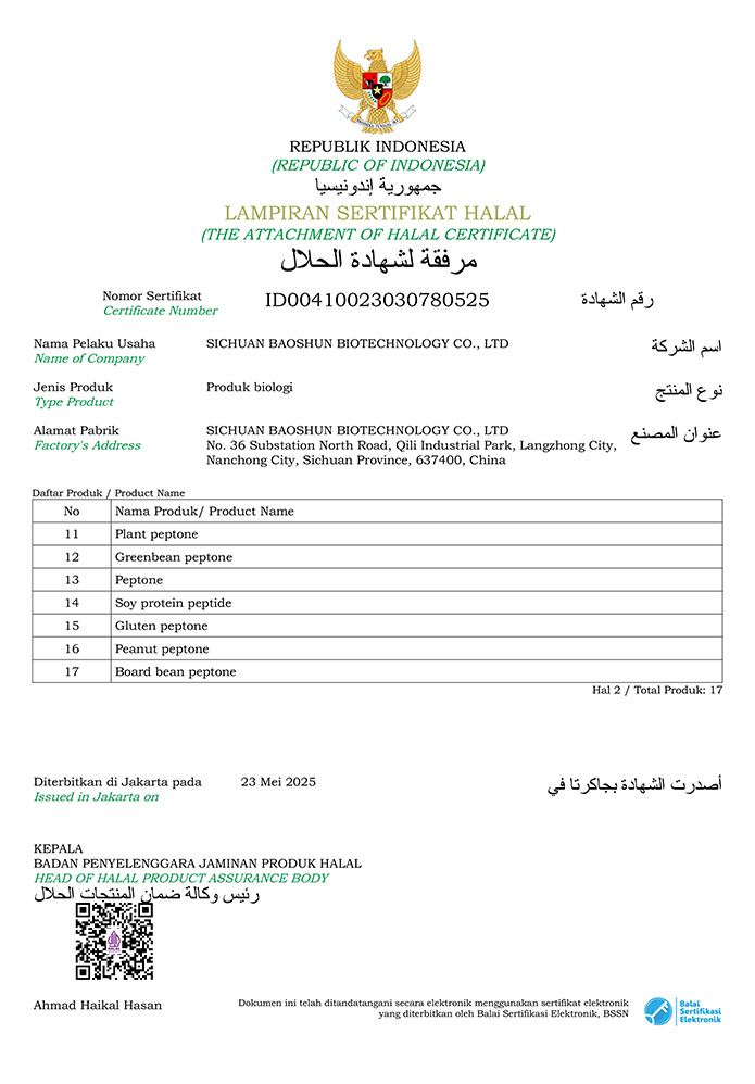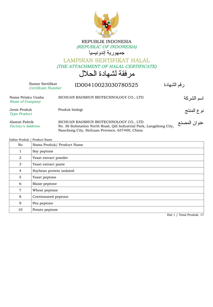 公司于2018年将培养基原材料生产基地迁往四川阆中七里工业园区。工厂一期、二期总建筑面积约40000㎡,员工100多人,以生产蛋白胨、大豆蛋白胨、胰蛋白胨、鱼蛋白胨、酵母蛋白胨、酪蛋白胨、酵母浸膏/粉、牛肉浸膏/粉等培养基原料和工业发酵原料的专业厂家。公司现有北京耀友、四川宝顺生物、四川蓉美吉、四川颖文、四川润小宝五家分公司。目前已通过ISO9001:2015质量体系认证和MUI清真认证。